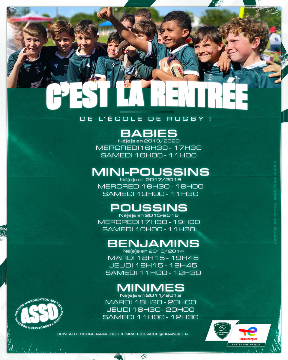 La rentrée de l'Ecole de Rugby s'est bien effectuée depuis le 31 août. retrouver les horaires d'entraînement de toutes les catégories en cliquant sur le lien ici : Horaires d'entrainements EdR